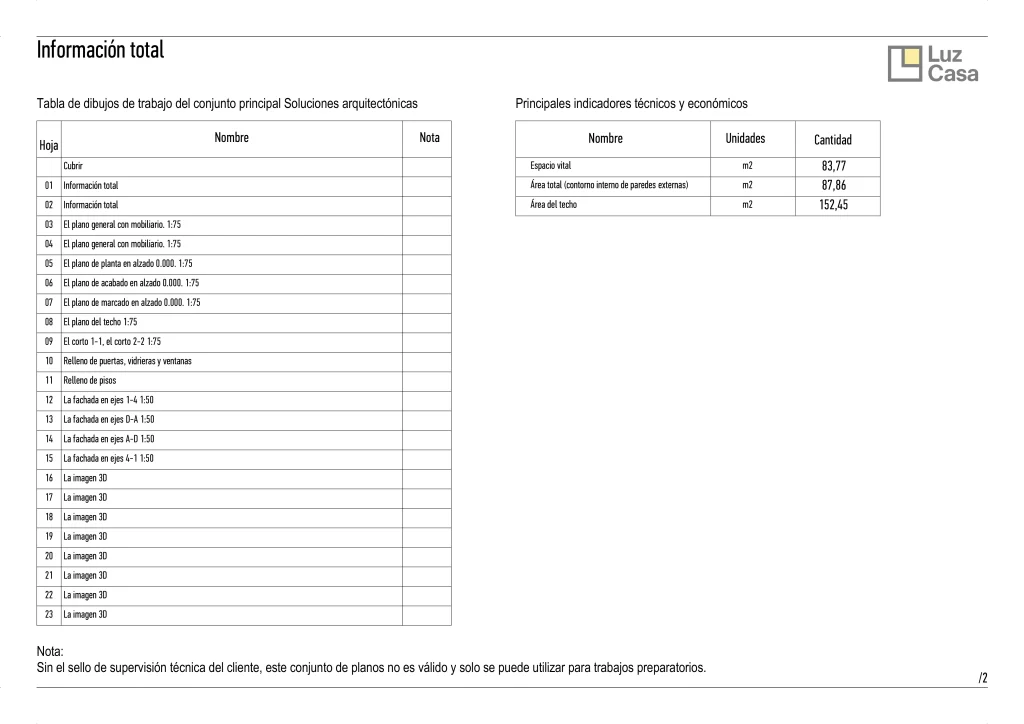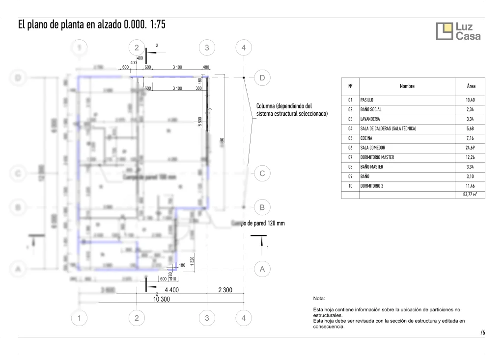 Casa moderna de una planta sin ático, con 2 dormitorios con baño privado, cocina integrada con sala y comedor, recibidor, lavadero y cuarto de caldera. Estructura de acero con hormigón celular, cimentación de losa monolítica. Fachada en ladrillo caravista y yeso, techo metálico inclinado. Ventanas con doble acristalamiento. Proyecto basado en normas del Metropolitano de Quito y adaptable al clima y al terreno.
